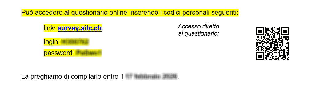 Cliccando sul bottone qui sotto può connettersi al suo questionario online (avrà bisogno del login e della password che ha ricevuto tramite lettera).